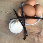 横浜市都筑区の織茂養鶏場の朝採のこだわり卵がたっぷり、マダガスカル産バニラビーンズ使用。